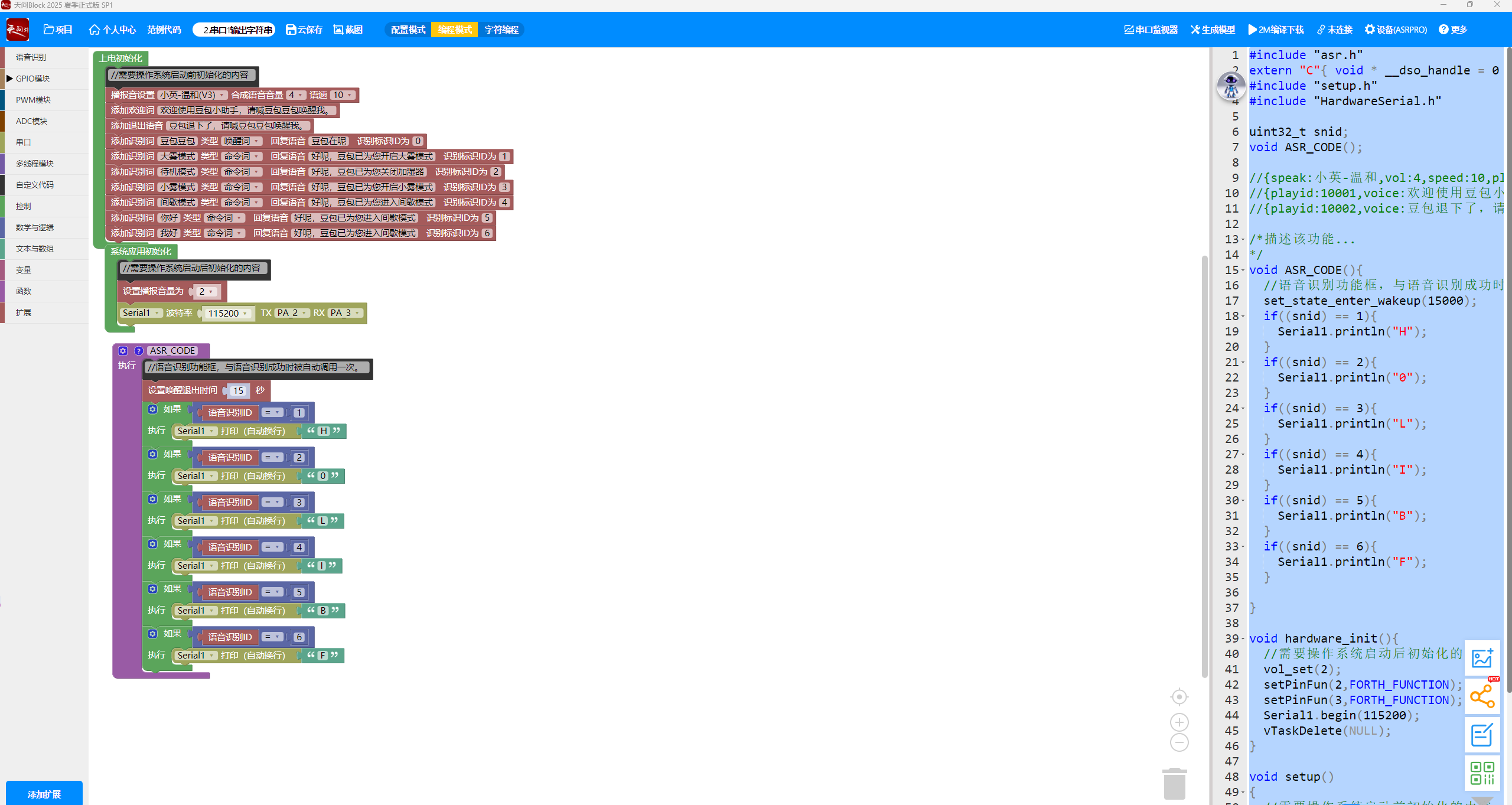 矩阵互联 ASRPRO 模块TX强制为PA2,与 PCB 硬件布线交叉矛盾。利用 ESP32-C3 的 GPIO 矩阵路由特性,实现 TX/RX 引脚职责的代码层动态对调。